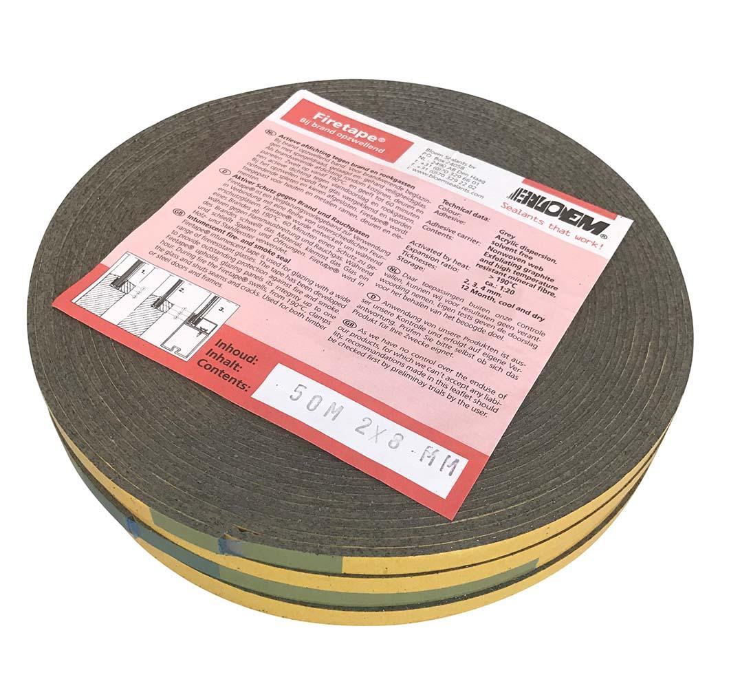 Firetape is een actieve afdichting die gedurende 30 of 60 minuten vlamdoorslag en rookgassen tegenhoudt Firetape is samengesteld uit temperatuurbestendige minerale vezels en grafiet. Het band is zonder risico voor de mens en het milieu.